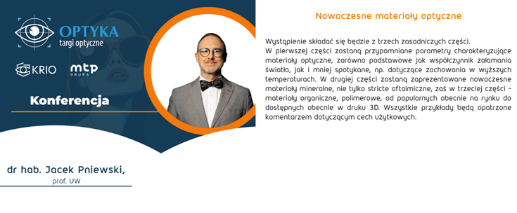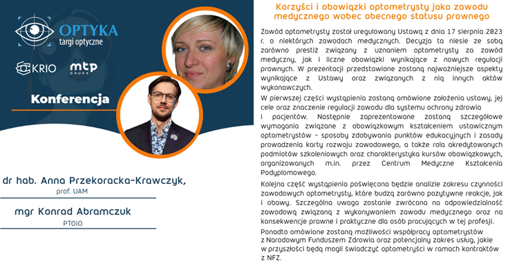 Integralną częścią targów OPTYKA pozostaje Konferencja Naukowa, która w tym roku odbędzie się pod hasłem: „Nowe rozwiązania i nowe metody dla optyki okularowej i optometrii”. Patronat nad Konferencją objął prof. dr hab. Ryszard Naskręcki. Zapraszamy w sobotę, 18 października 2025.